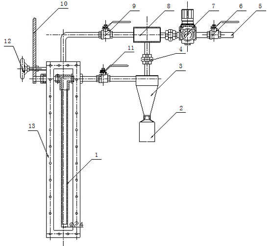 取樣前所有閥門(mén)為關(guān)閉狀態(tài),首先開(kāi)啟壓縮空氣控制閥6;根據(jù)壓力表顯示調(diào)整壓縮空氣調(diào)壓閥7將壓縮空氣壓力調(diào)節(jié)到所需壓力范圍。扳動(dòng)取樣操作桿10;將取樣管展開(kāi)與煤粉管道中;開(kāi)啟吹掃閥9;開(kāi)啟取樣閥11;取樣開(kāi)始,取樣2~4分鐘;關(guān)閉壓縮空氣控制閥6、吹掃閥9、取樣閥11;扳動(dòng)取樣操作桿10;將取樣管隱藏在外殼體13中;取下取樣瓶2;將煤粉樣品取出并將取樣瓶放回原處注意接口處的密封。